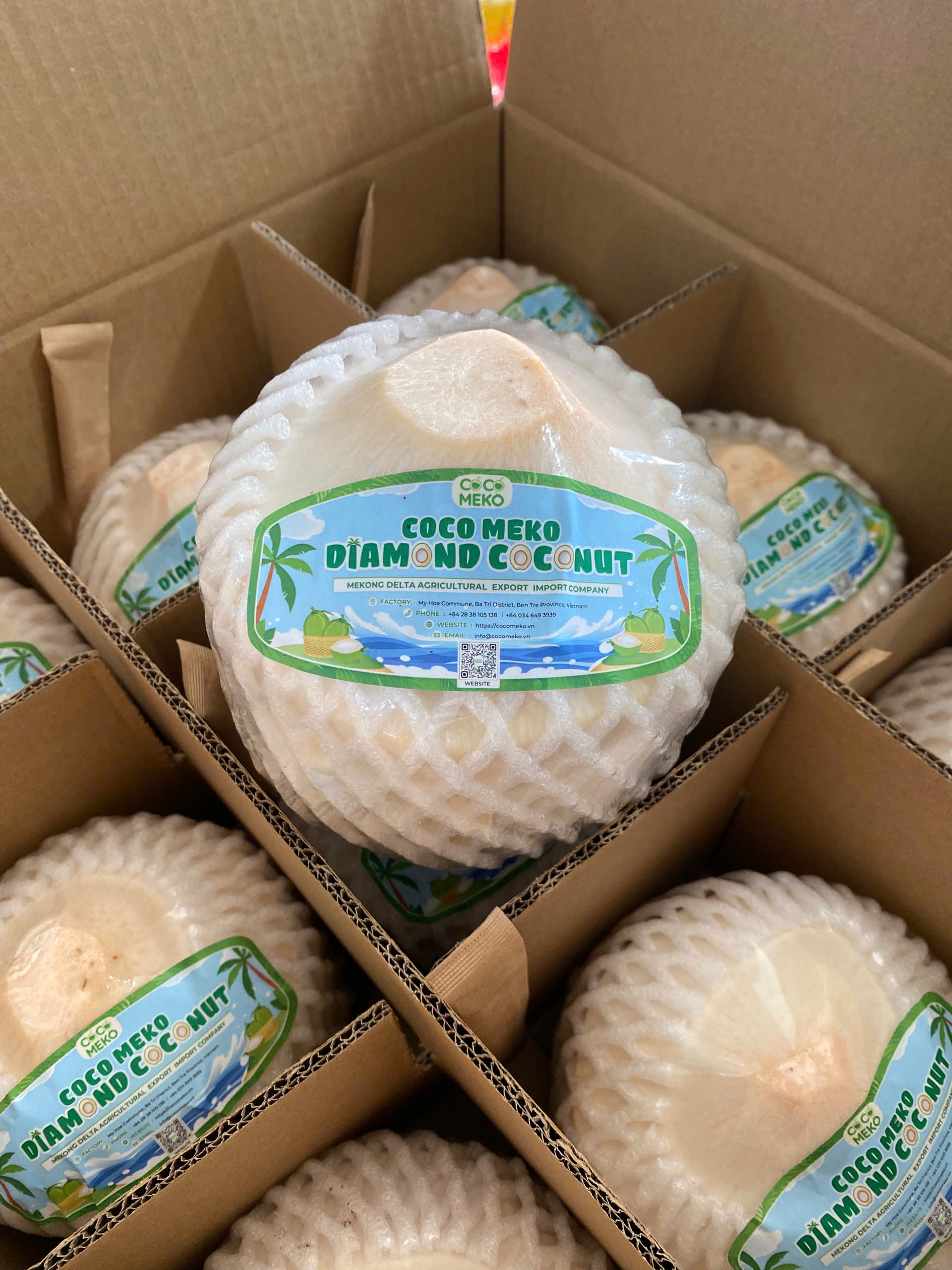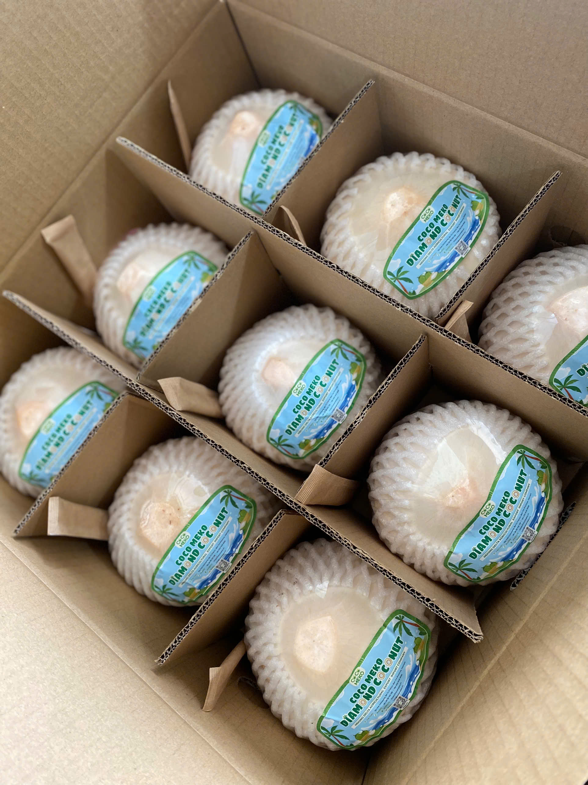 Diamond-cut coconuts from Mekong Delta Agricultural Export Import Company Limited, under the brand Coco Meko Fresh Coconut, are meticulously carved like diamonds, creating an aesthetically pleasing appearance. This cutting style not only looks beautiful but also helps to extend the coconut's shelf life. Size 600g - 1,100g/coconut
